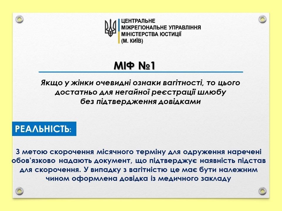 Реальність. З метою скорочення місячного терміну для одруження наречені обов’язково надають документ, що підтверджує наявність підстав для скорочення. У випадку з вагітністю це має бути належним чином оформлена довідка із медичного закладу.