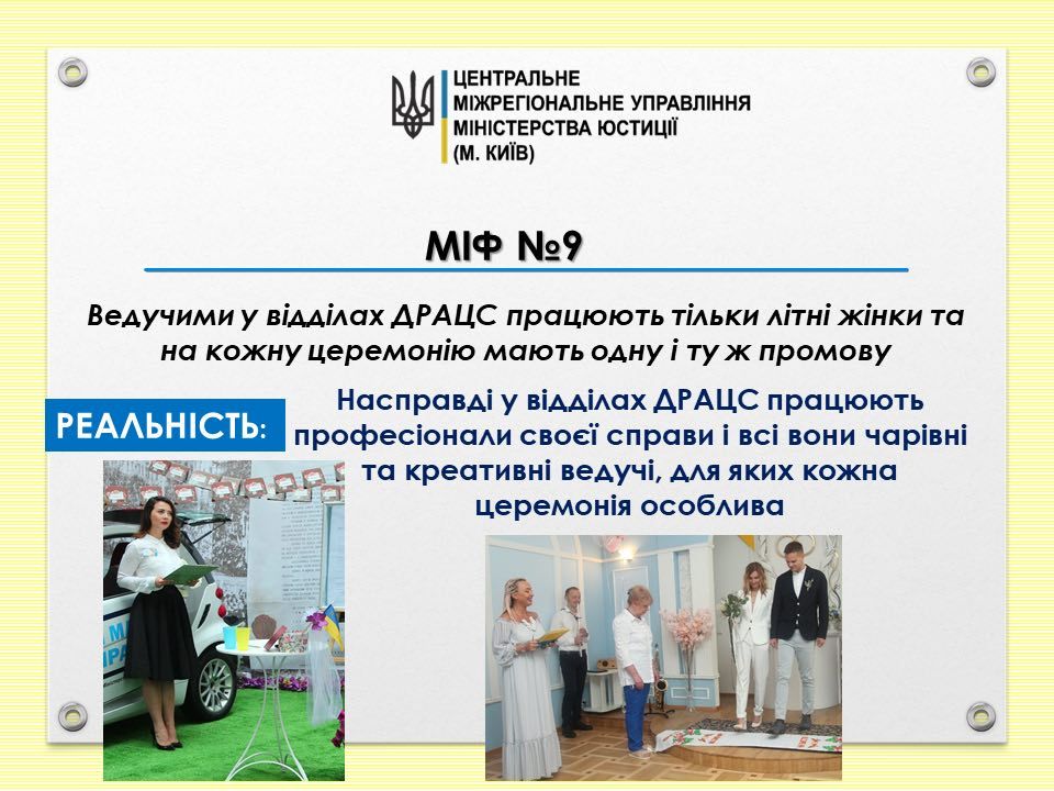 Міф 9. Ведучими у відділах ДРАЦС працюють тільки літні жінки та на кожну церемонію мають одну і ту ж промову