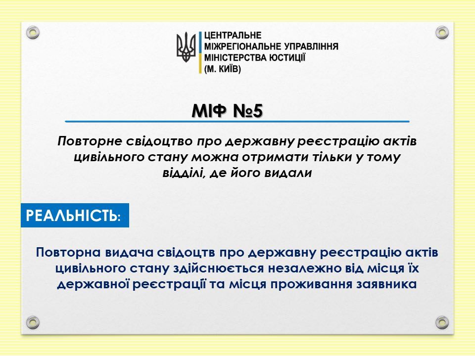 Міф №5. Повторні свідоцтва про народження можна отримати тільки у тому відділі, де його видали