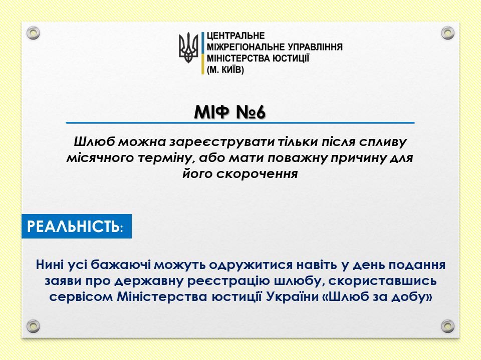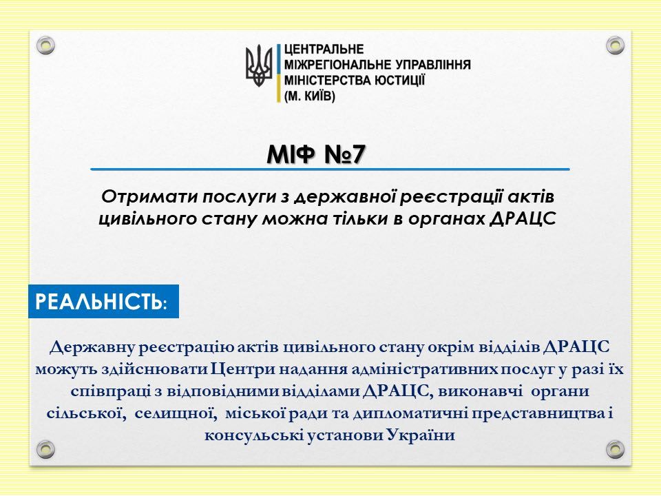 Міф №7. Отримати послуги з державної реєстрації актів цивільного стану можна тільки в органах ДРАЦС