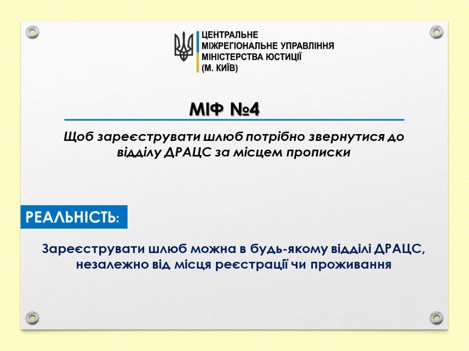 Міф №4. Щоб зареєструвати шлюб потрібно звернутися до відділу ДРАЦС за місцем прописки