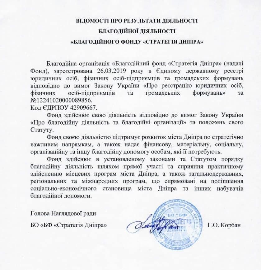 Цей проект вже підготовлений для голосування депутатами на наступну сесію міськради. І тоді всі грошові потоки, скоріш за все, йтимуть саме через цей «благодійний» фонд «Стратегія Дніпра», для чого, власне, він і був створений. І ще маленький нюанс: саме від цієї організації пан Корбан увійшов до громадської ради міста та потім її й очолив.
