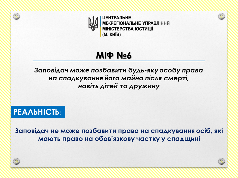 Міф 6: Заповідач може позбавити будь-яку особу права на спадкування його майна після смерті, навіть дітей та дружину.