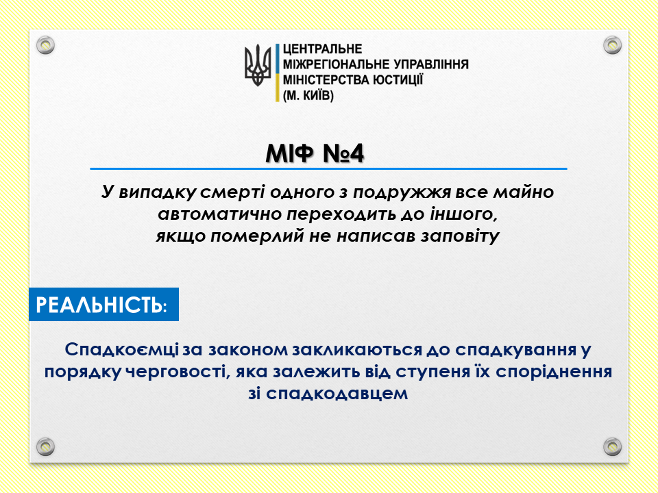 Міф 4: У випадку смерті одного з подружжя все майно автоматично переходить до іншого, якщо померлий не написав заповіту.