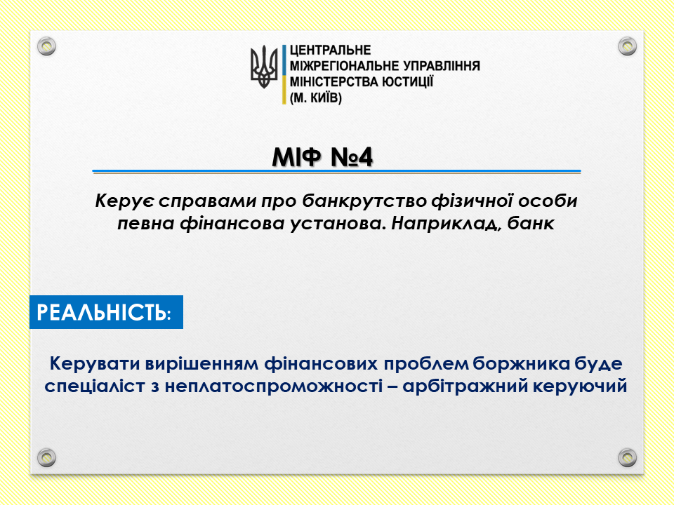 Міф 4: Керує справами про банкрутство фізичної особи певна фінансова установа. Наприклад, банк