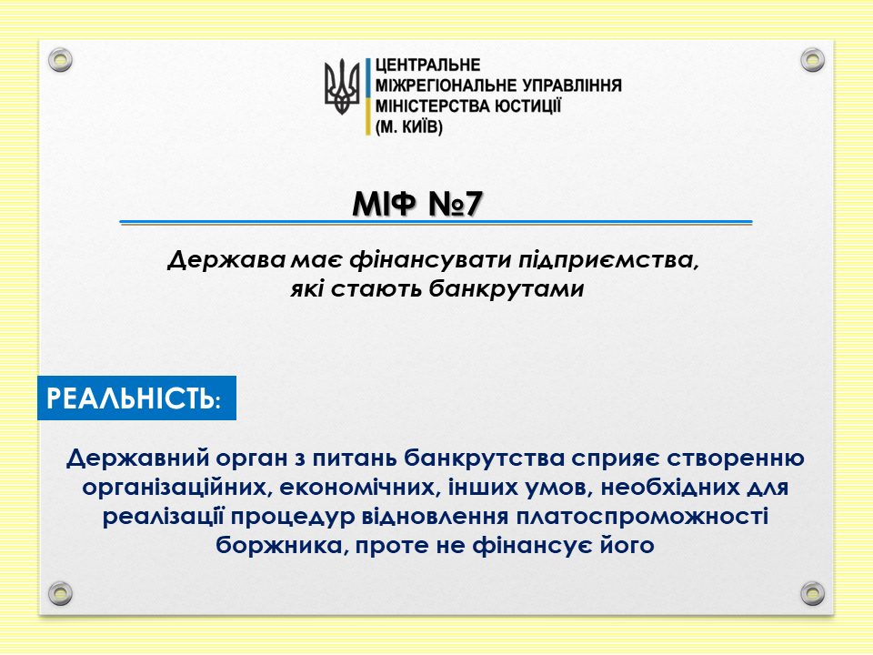 Реальність: Державний орган з питань банкрутства сприяє створенню організаційних, економічних, інших умов, необхідних для реалізації процедур відновлення платоспроможності боржника, проте не фінансує його.