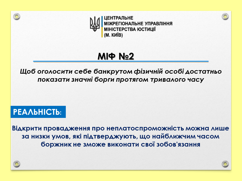 Міф 2: Щоб оголосити себе банкрутом фізичній особі достатньо показати значні борги протягом тривалого часу