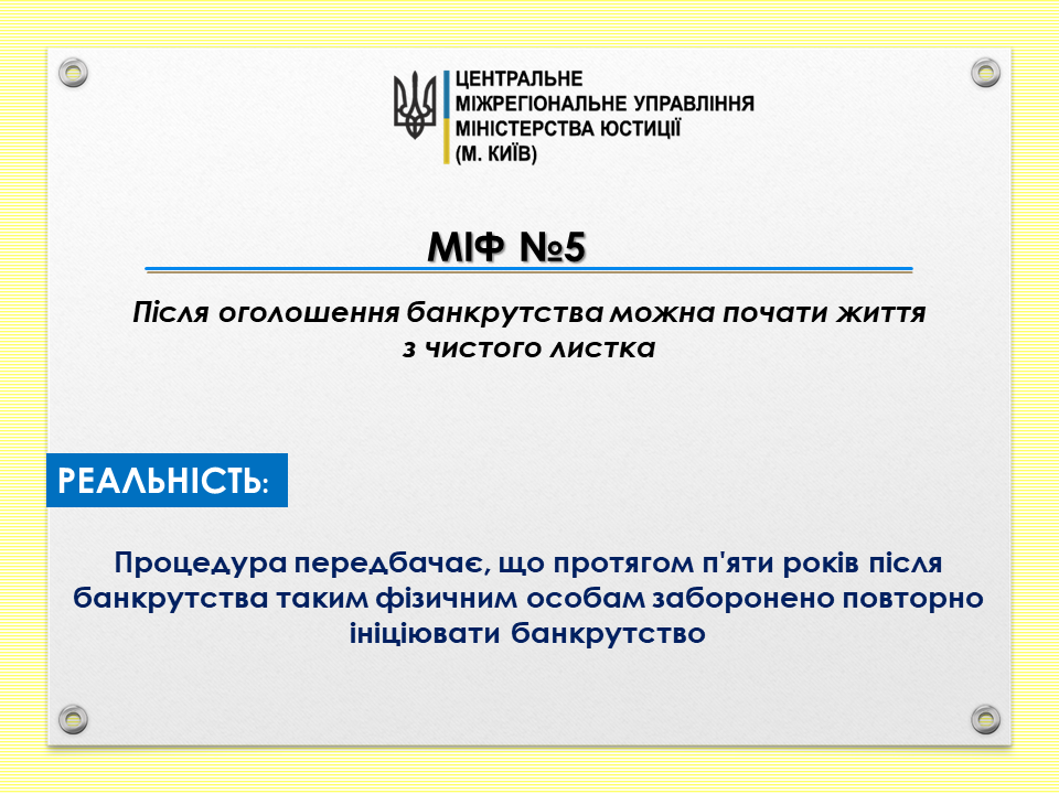 Центральна юстиція продовжує розвінчувати міфи, що стосуються роботи юстиції. Цього тижня у рубриці «Міф-Реальність» підібрали найпоширеніші стереотипи щодо процедур банкрутства.