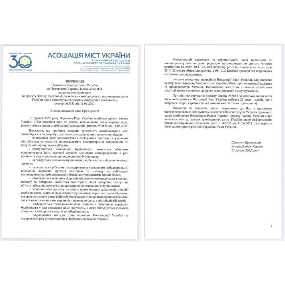 Асоціація міст України очікує на вето Президента щодо містобудівної діяльності