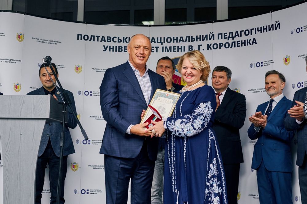 Олександр Федорович вручив ректорці Марині Гриньовій Подяку міського голови з нагрудним знаком за багаторічну сумлінну працю, високу професійну майстерність, сумлінне виконання службових обов’язків, вагомий внесок у розвиток освітньої та наукової галузі, відданість Полтавській міській територіальній громаді.