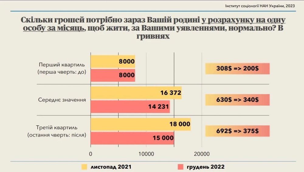 ‼️ Таким чином фінансові очікування українців після початку повномасштабної війни суттєво зменшились — у листопаді 2021 року вони вважали, що для нормального життя одній особі на місяць вистачатиме 16 372 грн ($630 за актуальним на момент опитування курсом).