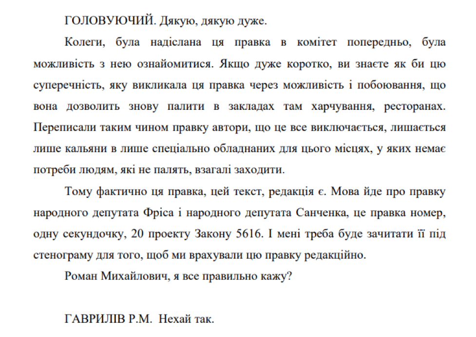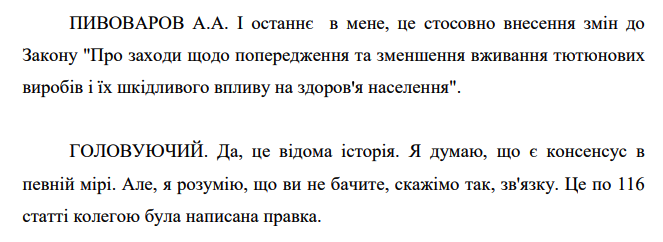 Ми уважно вивчили стенограму засідання Комітету з питань економічного розвитку 11 серпня 2022 року. Приміром, Пивоваров А. А., представник Міністерства аграрної політики та продовольства, яке ініціювало законопроєкт №5616, був вражений протягнутою тютюновою поправкою, але Голова економічного комітету Дмитро Наталуха йому популярно пояснив звідки взялася тютюнова поправка в євроінтеграційному законі.
