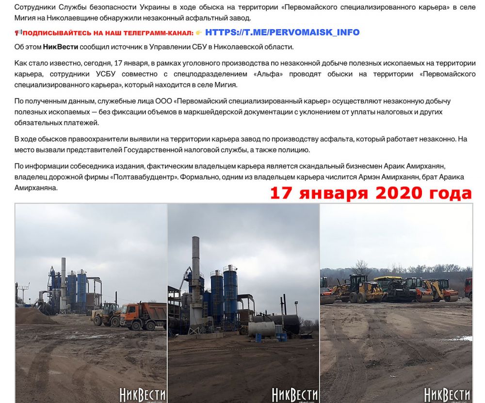 17 січня в рамках кримінальної справи по незаконному видобутку корисних копалин СБУ разом із спецпідрозділом «Альфа» проводило обшуки на «Первомайському спеціалізованому кар’єрі», що вів діяльність без фіксації об’ємів маркшейдерської документації та з ухиленням від сплати податків і т.д. , тобто діяльність – незаконна! Тоді ж там і було виявлено підпільний асфальтний завод і викликано податкову службу та поліцію. Дальше справа перейшла у стадію глибокого розслідування.